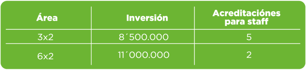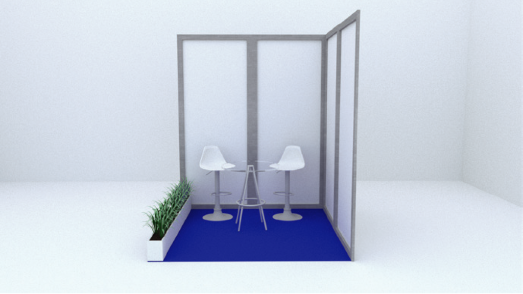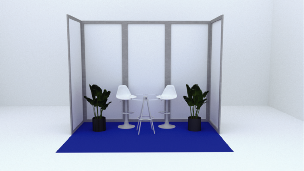 - Panelería de 2.40 m alto, 1 mesa rectangular, 2 sillas y espacio para exhibición de marca